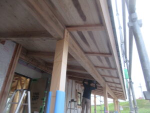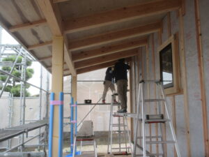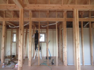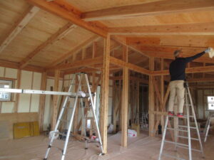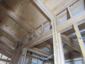 O大工さんによる内部木工事。間柱建てが進んでいきます。これから、お部屋の入口等もわかりやすくなってきます。