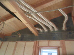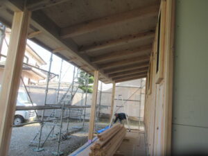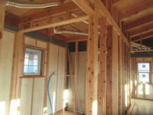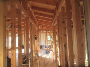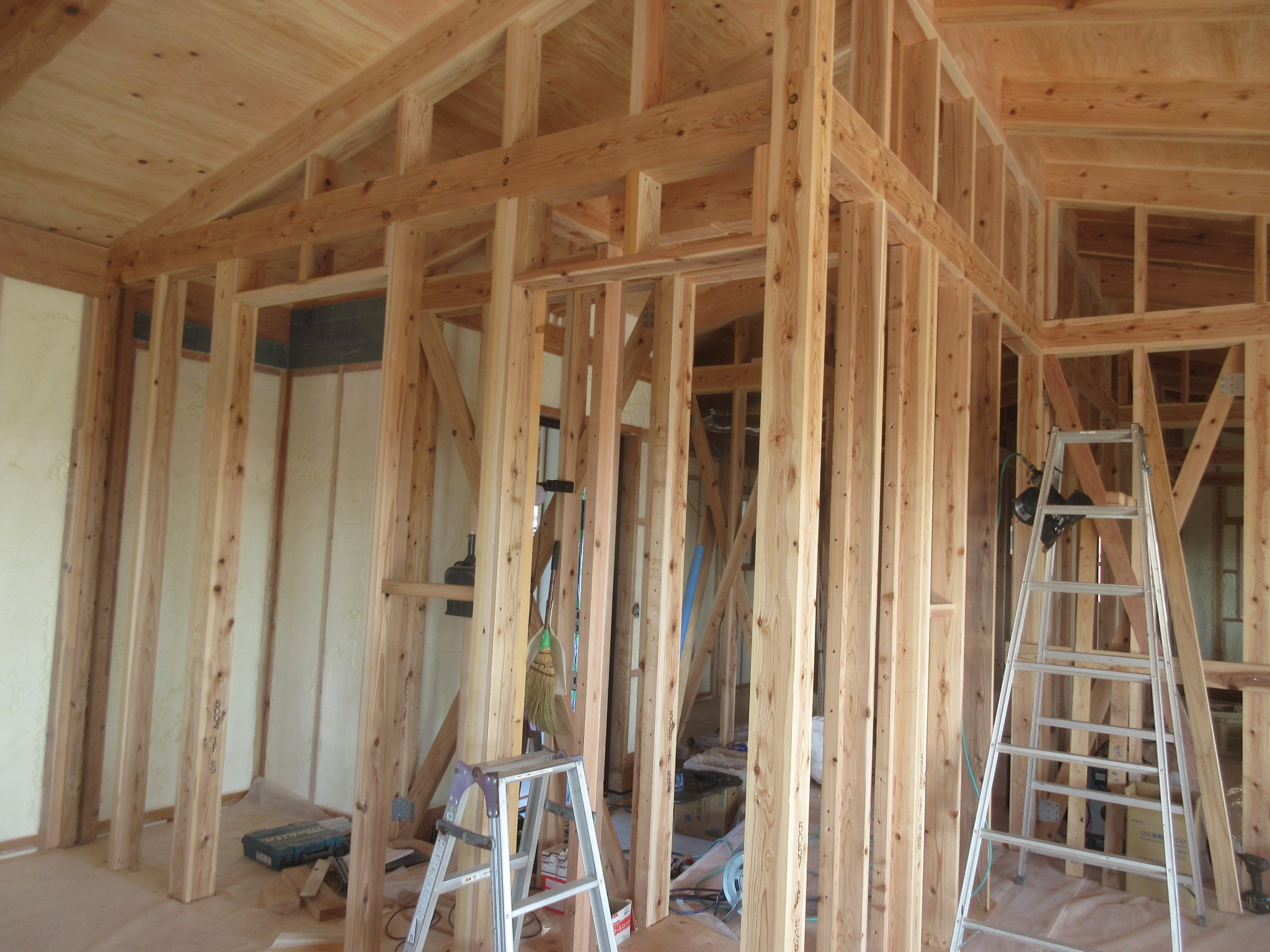 O大工さんによる内部の木工事は、間仕切り部の下がり壁、壁下地の間柱建て等が進められました。これから、天井下地や、床張りへと進んでいきます。
