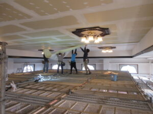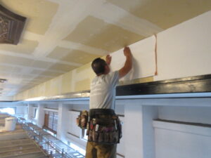 今日のM籐さんはクロスにのり付け係でした!9.2m流しで26本。さすがに4人掛りで貼っていくと一日で貼り終わりました。明日以降、最終チェックから清掃片付けをするそうです。今週末までに照明器具の清掃、既存梁の上の清掃、床面の清掃をやっておきたいと思います。来週の月曜日、火曜日で足場ステージ解体、水曜日、木曜日で養生撤去、清掃でお引渡しとなります。N納骨堂様、最後までよろしくお願い致します。
