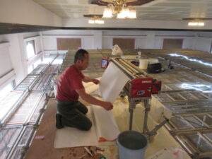 柳川市 N納骨堂様天井改修工事 ですがこちらは、クロス貼工事を進めています。
