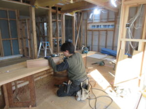 木工事は、河口さんです!今日も1階の木工事を急ピッチで進めています。今日はトイレ廻りの造作材です。ん?化粧柱が建ちましたね(*^▽^*) どんな納まりになるか乞うご期待です。K様、引き続きよろしくお願い致します。