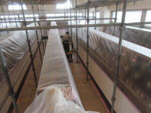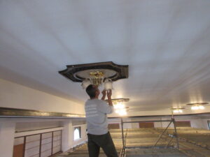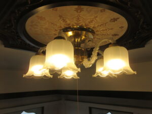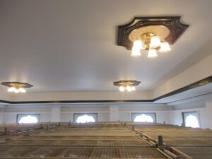 そして最後に、天井面についているシャンデリアの清掃!一個づつガラスの傘をはずしてガラスマイ〇ットで汚れをふき取りキレイになったところで戻していきます。鉄筋コンクリートの梁の上のホコリや汚れなどもキレイにして清掃完了!です。あとは、新規照明器具取替が3ケ、来週、足場の解体、養生はがし、清掃でお引渡しとなります。N納骨堂様、最後までよろしくお願い致します。