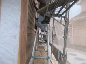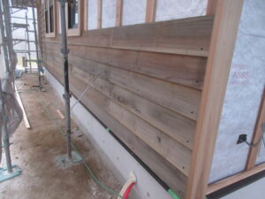そして、外壁工事で板張りが進み始めました。加工した杉板のよろい張りとなっています。