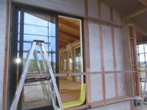 掃き出し窓の外部には、雨戸を収納する戸袋が組み立てられています。木製の雨戸ができる予定なんです。
