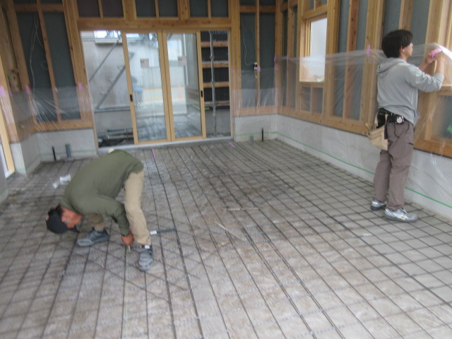 河口さんは養生!K林工業さんがワイヤーメッシュ張り、中間レベルの当てだしなどをやってくれました。これで準部万端です(≧▽≦) 明日は、村崎さんと私(高山)が一輪車でコンクリート運びます。K林工業さんがコンクリート均しです。K様、引き続きよろしくお願い致します。