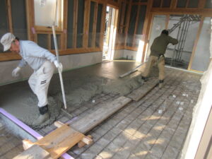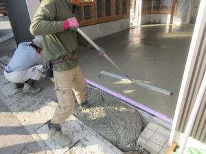 K林工業さんが2人態勢でコンクリートをならします。当社の村崎さんと私(高山)で一輪車で運搬(*^▽^*) 約3㎥(30㎡弱)厚み10cmのコンクリート打設です。