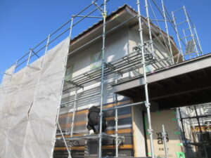 来週からいよいよ外壁のジョリパッド塗りが始まります!ので、S匠塗装さんが外壁、窓などの養生をやってくれました。外壁は上部がジョリパッド塗り、下部が杉板(タテ張り)張りとなっていてジョリパット先行で完了後に杉板張りを進める予定です。K様、引き続きよろしくお願い致します。