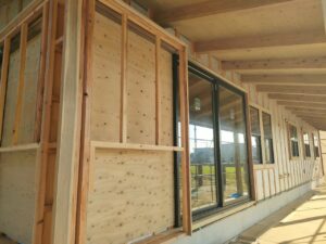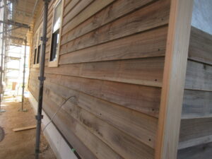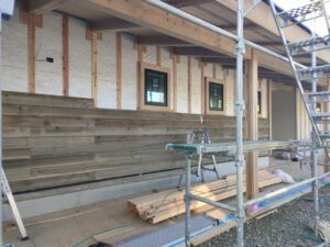 外部では、戸袋下地、外壁の板張りが着々と進められています。よろい張りです。