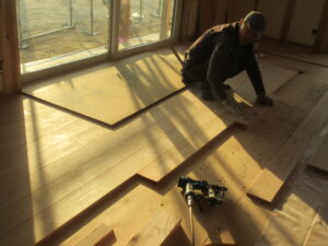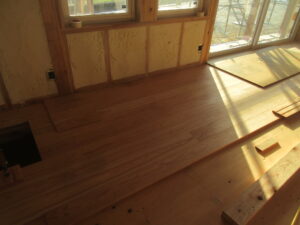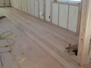 そして、無垢フローリング張りが、丁寧に進められています。この無垢フローリングは、当社の加工所で加工したものなんです。優しい木目と色合いが、なかなかいいです。足触りも優しくて、気持ちよさそうです。