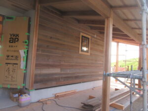 外壁の板張りは、東面と北面が完了して、南面へと進んでいます。