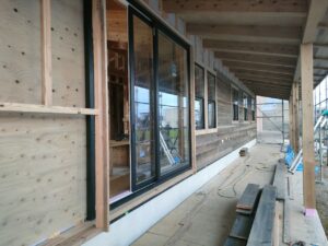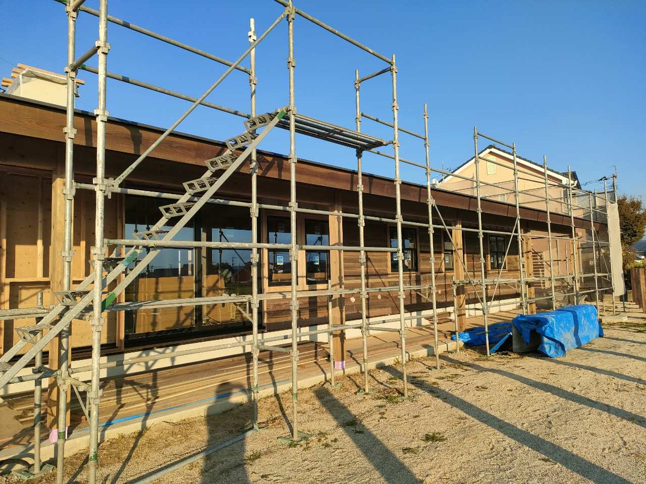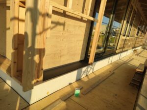 外部木工事は、外壁板張りです。南面の板張りまで進みました。