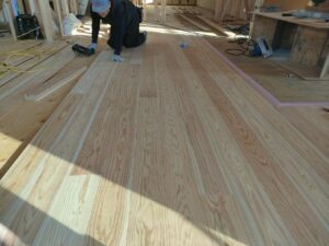 内部木工事は、O大工さんによる無垢フローリング張りが進められています。