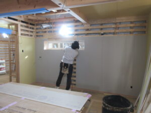 木工事は、今日も河口さんが一人で頑張ってくれています。今日も壁のベベルボード張りが進みました!来週も1階のボード張りを続けます。