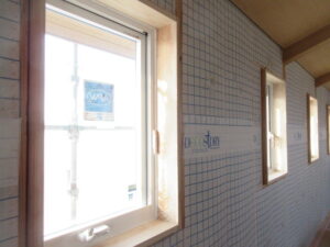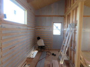 木工事は、河口さんが一人で頑張ってくれています。2階の壁下地板打ち、窓枠の取付、巾木の取付と!化粧木部のクリア仕上げ部の部材がすべて入ったのでクリア塗装も進めます。
