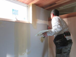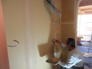 クロス工事は、Tけし美装のM籐さんです。クロス下地のパテ打ち完了です。明後日からまた現場に入られますが、パテ研磨からシーラー塗りへと進め、自然素材クロス貼を週末やってくれます。