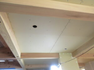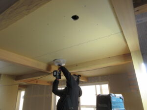 電気設備工事は、U都宮電気さんです。今日は天井開口作業です。クロス貼前にダウンライトの位置出し、開口と進めてくれました!来週末までには内装下地工事を完了させて吹抜足場設置まで行きたいと思います(≧▽≦) K様、引き続きよろしくお願いいたします。