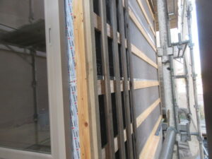 外部木工事は、T中大工さんです!今日から外壁杉板張りを始めました。大和張りの逆バージョンを今回やってみています。仕上がりを楽しみにお待ちください。K様、引き続きよろしくお願い致します。