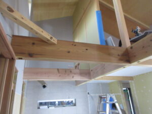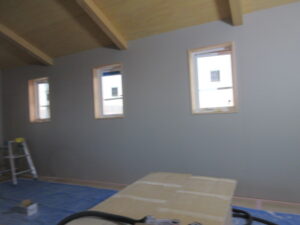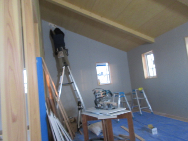 内部木工事は、河口さんです!今日は2階の壁ボード張りがほぼ完了しました。明日は手摺笠木の取付などでいよいよ内部木工事の完了(家具造作除く)のメドがたちそうです!そして今日は吹抜部の化粧梁の塗装を進めています。バトン塗料の黄色です。奥の梁が白いので違いが少しわかるでしょうか(*^▽^*) 明日、仕上げてしまいます!