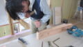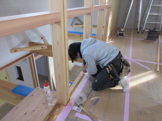 内部木工事は、河口さんです。2階吹抜の手摺とガラス止めが完了しました!この手摺壁は合せガラス(トーメイ)が入ります!午後からは、階段の割付作業、木材打合せをやっています。