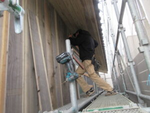 外壁杉板張り工事は、村崎さんとT中大工さんです!今日も北側の板張りを進めています。明日には北面完了して西面へと週末は行きそうですね(*^▽^*) K様、引き続きよろしくお願い致します。
