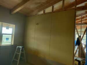 壁のボード張りが、ずいぶんと進んできました。明日、追加のボードが現場搬入される予定です。