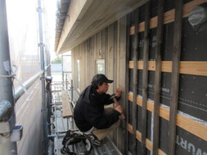 外壁杉板張り工事は、村崎さんとT中大工さんです。今日で東面、北面まで完了しました!来週末までにはメド付けたいですね(*^▽^*)