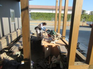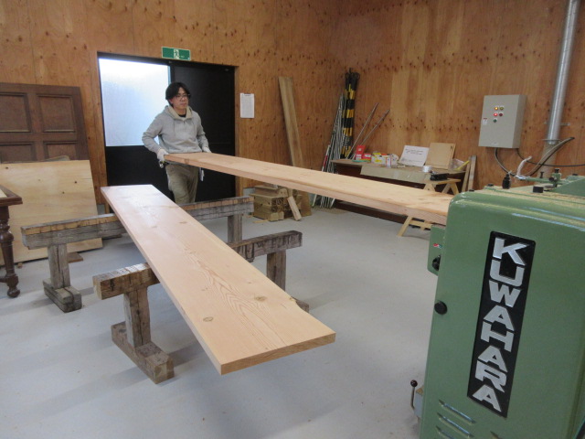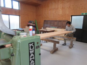 木工事は、河口さんです。今日は階段の無垢材の段取りから加工をやってくれました。階段の踊り場の材料を削っています。階段板、側板などです。