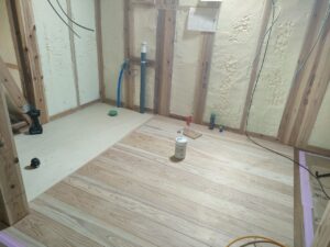 洗面スペース床の、無垢フローリング張り、トイレの床下地が進められました。トイレの床には、クッションフロアが貼られる予定です。