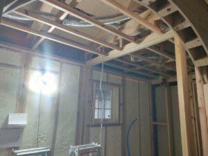 そして、この水廻りスペースの天井下地も進んでいます。天井には、当社で加工した無垢板材が張られますよ。