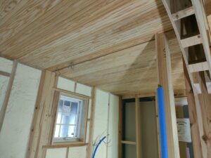水廻りの天井の無垢板張りが完了しました。リブのある無垢板になっていますので、ちょっと違う表情の天井になり、なかなかいいです。この無垢板も当社での加工です。