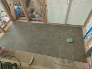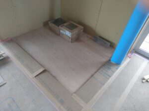 薪ストーブ置場の床の下地工事が完了しました。この部分は、床に300角のタイル張り、壁に石調のタイル張りとなります。