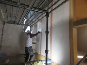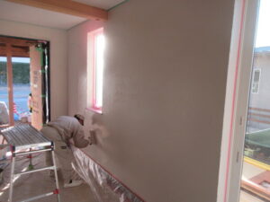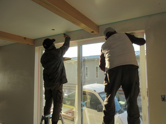 左官工事は、K林工業さん!今日は3人態勢で1階部分と吹抜部分の面積がある程度少なく縁(えん)が切れる部分のしっくい塗り仕上げをやってくれました。明日は、人数が6人くらいになりそうです(;^_^A 面積が広い吹抜の面積が広い部分を塗るには大人数が良いとの事です!