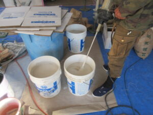 明日、使用数分のしっくいも夕方には練り置きしておきます。120㎡近い面積なんで左官さんも大変です(;^_^A 明日は現場がわちゃわちゃで賑わいそうですね(*^。^*) 木工事は河口さんが、倉庫の壁の針葉樹合板を張る段取りをしています。今月末には完了検査を受ける段取りで現場は進んでいます。