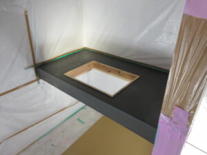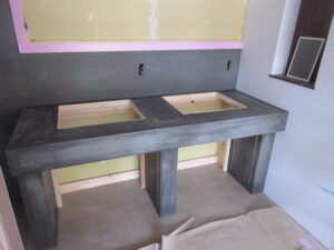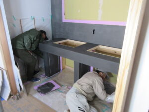 左官工事は、K林工業さんです。今日は洗面カウンター、トイレの手洗いカウンターの化粧モルタル塗りをやってくれました!洗面カウンターには洗面器が二個付きます。K様には3人の娘さんがいらっしゃるので(*^▽^*) 同時使用可能です(≧▽≦)