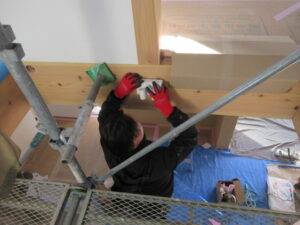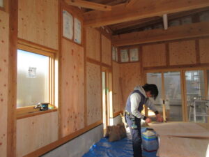 木工事は、河口さんです。倉庫棟の合板張りを進めています。また、吹抜のガラスが入ったのでガラス止め材もやってくれています。