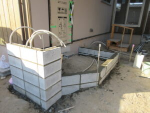 玄関ポーチは門柱のブロック積も進んで、照明器具やインターホンの配管も立ち上がっています。この高さから2段分に埋込ポストが入ります!明日以降もポーチ工事を進めていきます。K様、月末の29日に完了検査の予約を入れますね。あと少し、最後まで引き続きよろしくお願い致します。