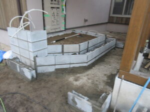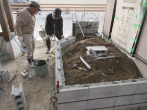 左官工事は、K林工業さんです。今日は2人態勢で玄関ポーチの階段下地ブロック積です。明日の午後から土間コンクリート打設を行います!明日は朝から埋戻し土入れを行います。今週末には、なんとかポーチ、門扉の形は出来上がりそうです!K様、最後まで引き続きよろしくお願い致します。
