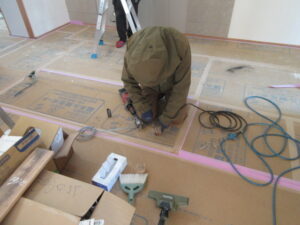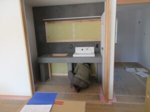 T中さん親子が床下立上り配管を完了してくれて、夕方には器具付けが始まりました。月曜日も引き続き内部器具付けを行うようです。
