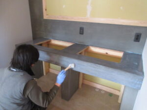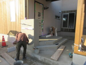 左官工事は、K林工業さん。今日も2人態勢で玄関ポーチの階段、門柱の造作です。埋込ポスト、が入る門柱もこんな感じです(*^▽^*) 最後は月曜日に黒モルタル塗りを行うので接着剤(ハイフレックス)塗布で本日の作業は完了です!