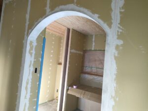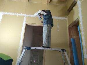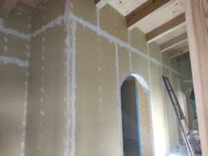 塗り壁工事の下地処理が進んでいます。ボードの継ぎ目、ビス部分、出角部分等をしっかり埋めて平滑にしていく下地処理の作業です。明日も下地処理作業が進んでいきます。