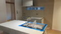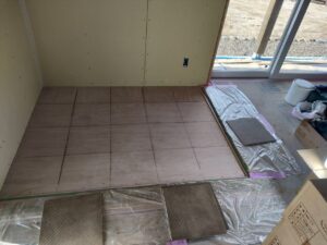 そして、薪ストーブ置き場の床のタイル張りも進みました。接着剤が硬化してから、目地詰めの仕上げとなります。明日からは、キッチン部分の壁のタイル張りも進めて頂く予定です。