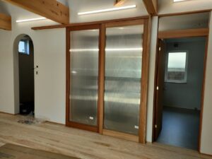 洗面所のアクリル框戸の塗装もしっかり終わりました。