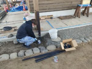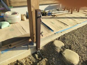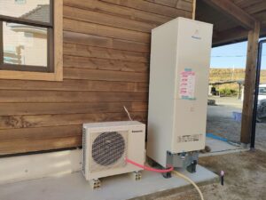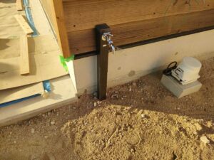 外部の水栓柱の設置、水栓BOXの設置、エコキュートの設置等が完了しました。