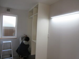 河口さんが家具の取付を進めてくれています。脱衣室の家具は天井付けで下部はOPENになっています(*^▽^*)