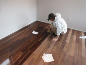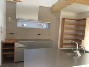キッチンの横には、天端合わせてカウンター収納、また冷蔵庫スペースの横にはL型のパントリーBOXができました。このBOXとキャビネットをつなぐカンターもできる予定です(*^▽^*) そして村崎さんは屋内では、寝室のウォールナットフローリングのオイル塗装をやってくれました。グッとステ木な色になってきました。