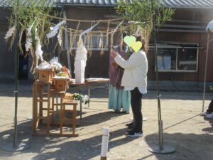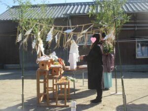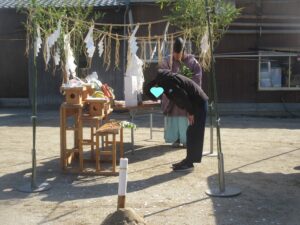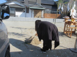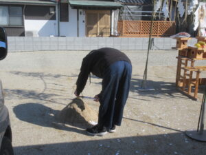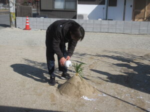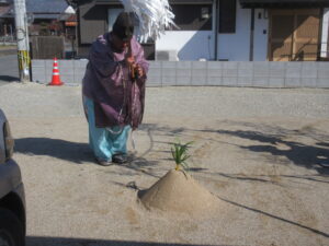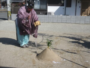 神事が進んで、四方清め(鬼門隅から時計回りで敷地の四隅と盛り砂にお清め)を神主さんとT様ご夫婦でやって頂きました。
