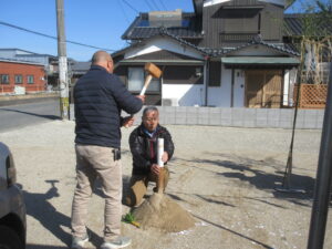 続きまして、刈初めの儀(ご主人様)、鍬入れの儀(奥様)、杭打ちの儀(当社社長と担当の高山)を厳かに進められました(*^▽^*)