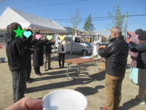 最後に、直会(なおらい)参列者全員でお神酒を頂き、「乾杯!」です(*^▽^*)記念撮影もしっかりとやらせて頂きました(≧▽≦) T様、これからステ木なおうち造りがスタート致します。一緒に楽しく竣工、お引渡しまで進めれるようにスタッフ一同頑張っていきます。早速、来週から、やり方出し、杭工事が着工致します。これからもどうぞよろしくお願い致します。本日は誠におめでとうございます。