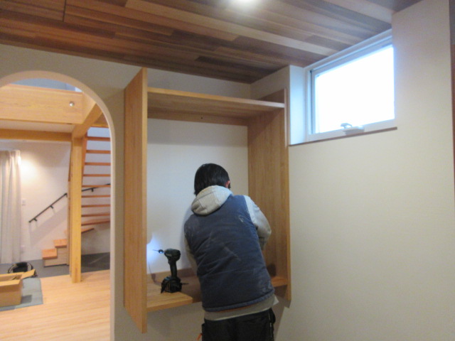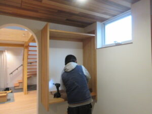 河口さんが、家具の取付を進めてくれています!キッチン廻り、寝室廻り、納戸廻りと!家具が付くと、生活感が出てきておうちらしくなってきますね(≧▽≦) 中庭には人工芝張りも河口さんがやってくれています。明日は、外構工事の植栽帯部に小栗石を敷き詰めますよ(*^▽^*)