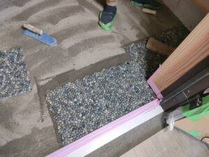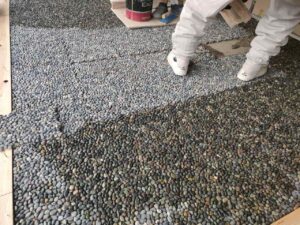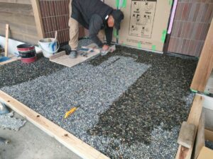 シートの取り合い部分には隙間ができますので、そこに、玉石を入れ込んでいきます。そして、平坦になるように、コテで押さえていきます。